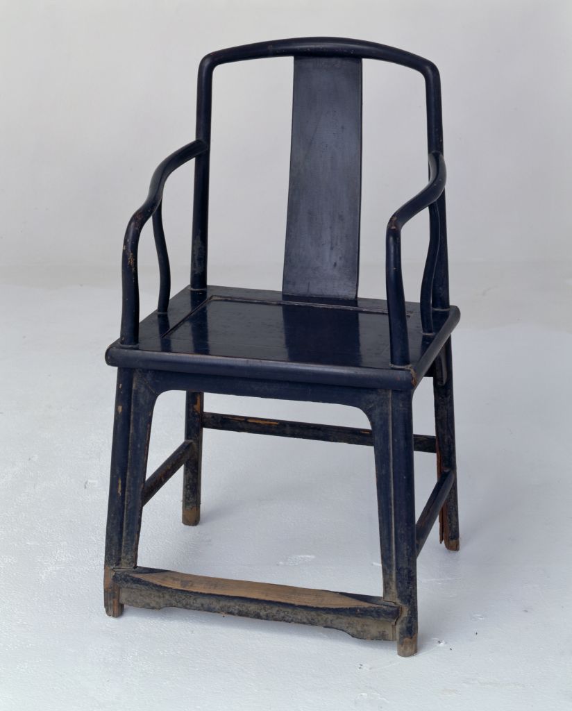 黑漆南官帽扶手椅,高98厘米,长58厘米,宽50厘米。 此椅为南官帽椅形式,搭脑、扶手、联帮棍皆用弧形圆材制作,靠背板略微曲。座面镶板落堂作。通体髹黑漆,属素漆家具,是明代制作和使用最为广泛的家具品种。 据原登记档案,此椅为上书房之物。上书房位于乾清门内左侧,清代雍正时设,为年及6岁的皇子及近支王公子弟的读书处。装在椅背或衣架之上用于连接立柱和背板的构件。椅背搭脑一般正中稍高并略向后卷,以便人们休息时将头搭靠其上,故名。明式官帽椅(扶手椅)扶手下装饰的曲弯构件,下粗上细,亦称“耗子尾巴”。一般指断面为圆形的木料。主要构件断面为圆形的家具常称以圆材制作。亦称欹床。中国传统家具中的一种坐具,现已很少见。其形式犹如椅子的靠背,是一种无座腿甚至无座面的坐具。其背后安有可以撑放的活动支架,可根据使用者的要求调节靠背的角度。它多在床榻上或席地使用。明高濂《遵生八笺》中说:“靠背以杂木为框,中穿细藤,如镜架然。高可二尺,阔一尺八寸,下作机扃,以准高低,置之榻上,坐起靠背,偃仰适情,甚可人意。”宋、明绘画中也可见到此种坐具。木工术语,特指一种攒框镶心的作法,分落堂和不落堂两种。凡板心四边低于四面边框的均称“落堂”,板心与边框齐平的均称“不落堂”,此种作法常见于柜门、屏风的眉板和下裙板及椅面、凳面的板心上。