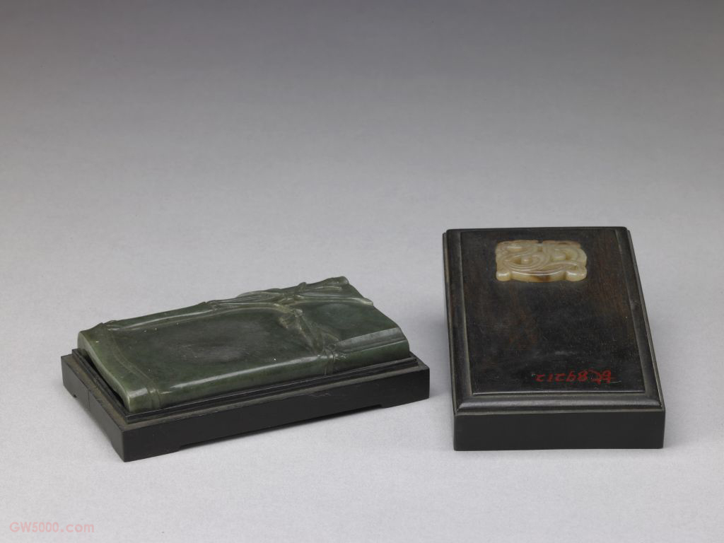 碧玉竹节式砚,清,长9.9厘米,宽5.7厘米,厚1厘米。 砚为碧玉质。长方形,雕作竹节式。正面凸雕竹纹,一枝竹枝叶横出,把砚划分为两部分,上部砚池微凹,下部的受墨处平润,下端雕竹节纹。背面为剖开的竹节纹。砚外有长方形嵌玉木匣,所嵌玉为透雕螭纹。 此器的设计与雕工都颇为精巧,为清代宫廷极为珍贵的文房用具。 碧玉是新疆和阗软玉中的一个品种,软玉主要有白玉、青玉、碧玉、墨玉、黄玉等品种。其中碧玉色如菠菜叶,略有透明感,呈油脂或蜡状光泽。由于所含成分不同,颜色和结构均不如其它软玉均一,色彩淡的呈菜色,色彩深的呈墨绿色,还有斑杂的大环斑状。 砚面贮墨汁处,或称墨池,多为深凹小池。砚池多有富于装饰性者,以安排之巧、形状之奇或纹饰雕刻取胜。 雕刻技法之一。一种是在浮雕的基础上镂空背景部分,有单面雕、双面雕之分。另一种介于圆雕和浮雕之间,常用于民间床、窗、梁、护板的雕刻中。 螭,传说中的一种龙,又名螭虎龙。明式家具常用为装饰纹样。雕镂之工。
