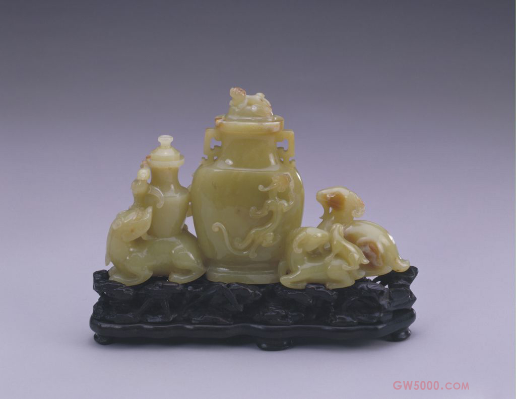 此器选用上好名贵的黄玉精雕细琢,并有“乾隆年制”的款识,不失为清中期具有代表性的玉器珍品。玉材中最名贵的品种之一。其色泽由淡黄至深黄不尽相同。最名贵的黄玉色泽纯正,材料极其难得,特别是上好的新疆黄玉目前极为少见。清代黄玉作品中,玉质多属上乘,其黄色正而娇,莹润如脂,是玉中的佼佼者,其价值绝不亚于羊脂白玉。为我国传统吉祥图案之一,亦称“三阳交泰”。“泰”为《周易》中六十四卦之一,乾下坤上,以象“天地交而万物通也”,其初、二、三爻皆为阳,意在阴消阳长,“内阳而外阴,内健而外顺”。《周易》载:“十月为坤卦,纯阴之象;十一月为复卦,一阳生于下;十二月为临卦,二阳生于下;正月为泰卦,三阳生于下。”也就是说,农历正月为六十四卦中的“泰卦”,冬去春来,阴消阳长,有吉亨之象。在一年起始冬去春来之际,古人常以“三阳”(羊)寓示“泰”卦,表达喜迎新春之意。羊与阳谐音,所以艺术家们常以三羊为题材来装饰工艺品,寓意太平盛世,国泰民安。
