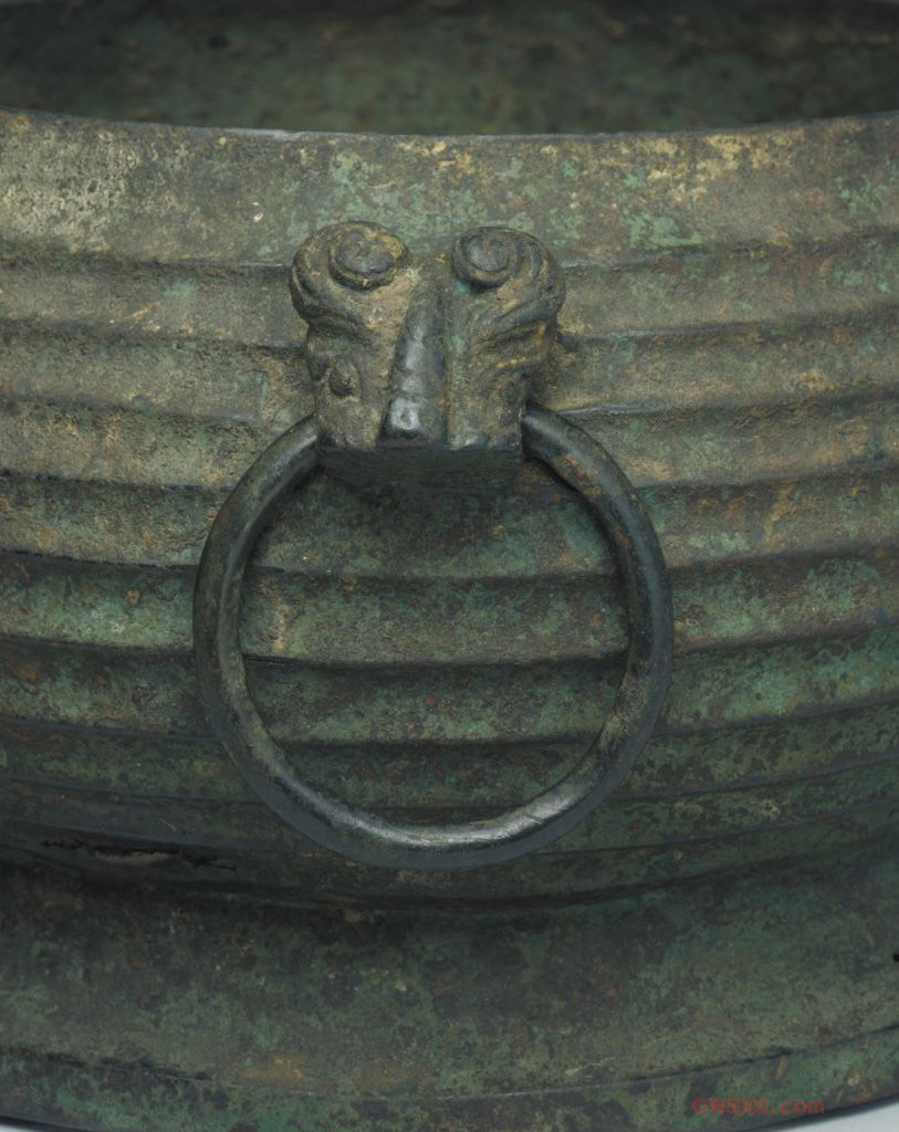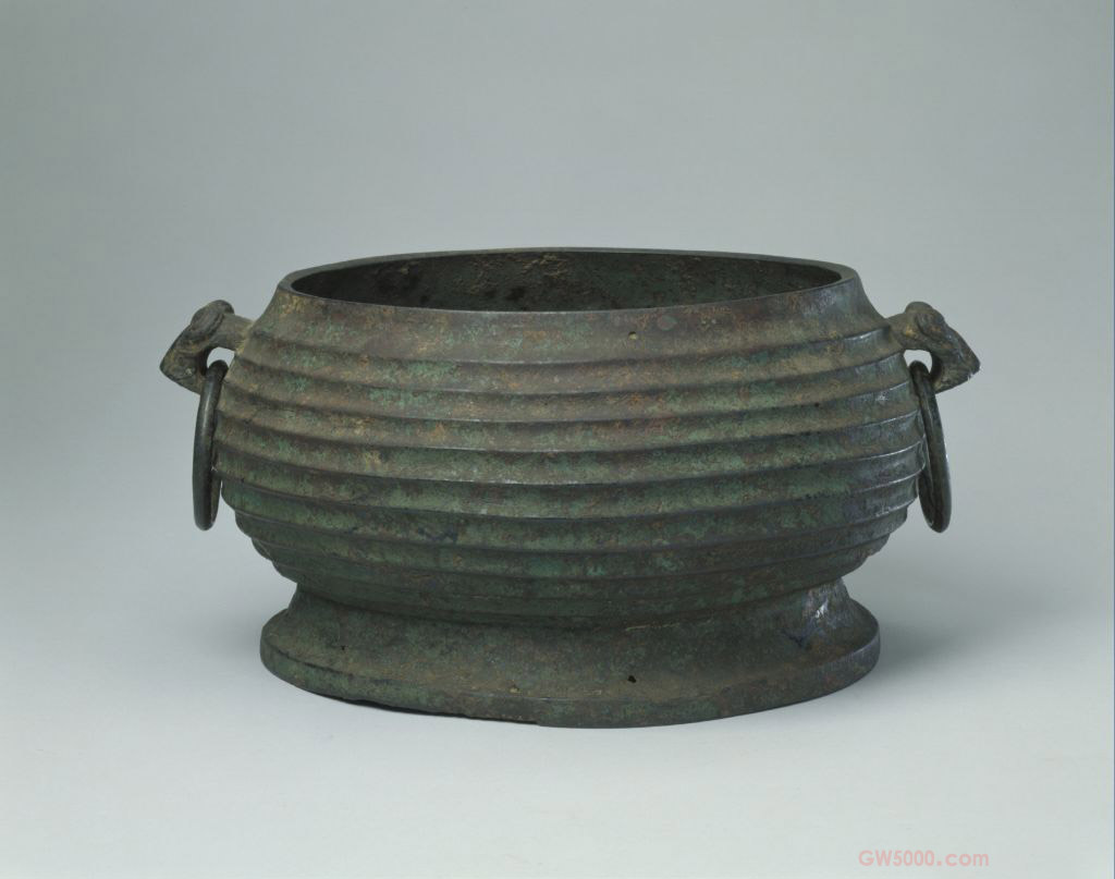 簋弇口,圆鼓腹,圈足,腹两侧有兽首衔环耳.器身自上而下满饰平行的瓦棱纹。