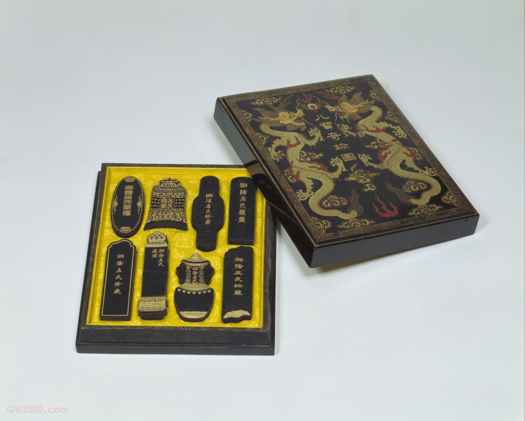 胡开文八宝奇珍墨为八锭一套,造型各异。按自右而左、先上后下的顺序分别为: 碑形墨,长10.8厘米,宽3厘米,厚0.9厘米。墨正面阴文填金篆书“湘阴左氏藏墨”六字款。背面镌刻“有虞十二章”图。墨侧阴文楷书“徽州休城胡开文造”。 断木形墨,长11厘米,宽3.4厘米,厚0.9厘米。墨通体卷云纹装饰,上下两端填金断木轮纹式。正面阴文填金隶书“湘阴左氏珍藏”。背面填金阳文卷云纹三轮。墨侧楷书阴文“徽州休城胡开文造”。 亚形墨,长11.8厘米,宽3.8厘米,厚1.1厘米。墨通体卷云纹装饰。正面阴文填金行书“湘阴左氏珍藏”。背面钤篆书“香”字印,下端填金双龙戏球图样,墨侧阴文楷书“徽州休城胡开文造”。 宝瓶形墨,长10.1厘米,宽4.5厘米,厚0.9厘米。墨正面阴文填金隶书体“玉壶冰”三字,宝瓶颈部填金楷书“湘阴左氏”,瓶盖以描金宝莲花衬托佛光纹装饰。侧墨阴文楷书“徽州休城胡开文造”。 古编钟形墨,长8厘米,宽4.1厘米,厚0.6厘米。墨正面描金仿古编钟纹样,双螭纹蒲牢图,中间阴文填金篆书 “左氏珍藏”四字。 碑形墨,长13厘米,宽3.2厘米,厚1厘米。墨上一龙飞腾,正面头尾相接,通体龙缠碑图样,上下端均以如意纹装饰。正面阴文填金楷书“湘阴左式藏烟”。墨侧阴文楷书“徽州休城胡开文造”。 舌形墨,长9.9厘米,宽3.8厘米,厚0.9厘米。墨正面阳文描金双龙戏球图。背面描金四连宝相花边装饰,中央阴文描金隶书 “湘阴左氏藏烟”字样,墨侧阳文楷书“徽州休城胡开文造”。 碑形墨,长11.7厘米,宽3.2厘米,厚1厘米。墨正面双龙戏珠纹装饰。背面周边描金线,中央阴文填金楷书“湘阴左氏珍藏”。 此套墨墨质黑黝坚润,做工颇细。8锭墨同装一黑漆描金彩色双龙戏珠图盒内,盒面中央描金隶书“八宝奇珍图”五字。胡开文:中国近现代制墨名家。胡开文为徽墨品牌名、店名、制墨家族名,是徽墨休宁派的代表。它是中国历史上经营规模最大的制墨企业,也是徽州制墨历史上最悠久的老字号之一。至新中国成立时期,前后共延续了七代传人。墨业创始人为胡天注(1742-1809年),名在丰,字柱臣。清代徽州府绩溪上庄人。其早年家境贫寒,少年时在休宁县城海阳镇汪启茂墨店当学徒。乾隆三十年(1765年),胡天注在海阳镇打出“胡开文墨庄”店号。胡天注次子胡余德(1762-1845年)则推出了一批过得硬的产品,胡开文墨号也由此兴盛,因而世人经常将其与其父胡天注混淆。胡开文品牌的打造凝聚着胡天注派下几个家支数代子孙共同的心血。清代末年,由于战乱频繁以及社会变革,整个徽墨业都处于萎缩状态。在这种极其萧条的情况下,唯有胡开文家族由于徒孙众多,分布大江南北,独呈一枝独秀。特别是到19世纪末、20世纪初,胡开文品牌已经誉满中外,最终垄断了全国的徽墨市场。胡开文墨中有相当数量种类被长期充作贡品进入宫中。1915年所制之“地球墨”在美国旧金山举行的“太平洋万国巴拿马博览会”上获金质奖章。民国时,面对中国传统文具业的整体颓势,某些胡开文后裔开始将“胡开文”的冠名权加以出租、出售。于是以“胡开文”招牌为号的墨店开始分布于全国各地。此举一方面继续扩大了胡开文品牌的市场影响力,另一方面却导致墨品质量的良莠不齐。佛前供器,藏文称之为“八吉祥相”。由法轮、法螺、宝伞、白盖、莲花、宝罐、金鱼、盘肠八件组成。每件供器含义不同:轮代表佛说大法圆转,万劫不息;螺代表菩萨果妙音吉祥;伞代表张弛自如,曲覆众生;盖代表遍覆三千,净一切乐;花代表出五浊世无所染;罐代表福智圆满,具完无漏;鱼代表坚固活泼,能解坏劫;肠代表回环贯彻,一切通明。因为八宝寓意吉祥,所以成为我国传统工艺中的主要纹饰。 篆刻的一种方式,即把印文镌成凹状,在纸上钤盖时印文是白色,因而又称为白文。 十二章为《书经·虞书·益稷篇》所载“予观古人之象,日、月、星辰、山、龙、华虫、宗彝、藻、火、粉、米、黼、黻。”除日、月、星辰外,称九章。 古代帝王礼服和吉服上的十二种装饰纹样,依次是日、月、星辰、山、龙、华虫、黼、黻、宗彝、藻、火、粉米,始于传说中的舜禹时代,《书·益稷》记载舜和禹讨论君臣之道时说:“予欲观古人之象,日、月、星辰、山、龙、华虫作会,宗彝、藻、火、粉米、黼、黻、絺绣,以五采彰施于五色作服,汝明。”以后各代沿用其制,成为帝王服饰的专用纹样。清时,一般是日、月、星辰、山、龙、华虫、黼、黻在衣,宗彝、藻、火、粉米在裳。十二章各有取义,以象征帝王的风操品行:日、月、星辰取其照临昭明,山取其能兴云雨,龙取其善变化,华虫取其文章和耿介,宗彝取其威猛和忠孝,藻取其文,火取炎上,粉取洁白,米取能滋养,黼取能决断,黻取善恶相背。帝王以下,公卿诸侯品官大臣依等级可用九章、七章、五章、三章不等。十二章的装饰纹样具有浓厚的等级色彩。 在玉器等工艺品中也可看到十二章纹饰。 篆刻的一种方式,即把印文镌成凸状,在纸上钤盖时印文是红色,因而又称为朱文。 瓷器装饰手法之一。其工艺是以毛笔蘸调和好的金粉,在烧好的瓷器上描绘图案花纹,然后入炉经低温烘烧而成。描金创烧于北宋定窑,南宋人周密《志雅堂杂钞》记载:“金花定碗用大蒜汁调金描绘,然后再入窑烧,永不复脱。”用大蒜汁调和金粉是利用其天然的粘性。明清的景德镇御窑厂亦常