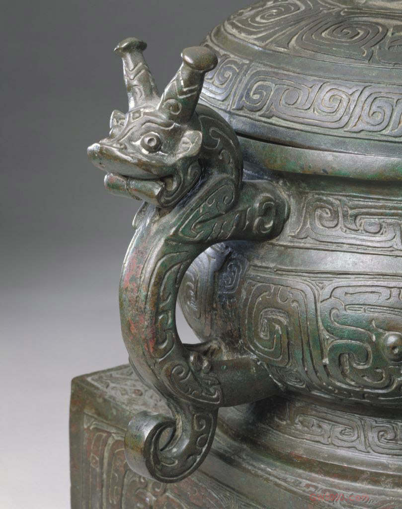 簋(音鬼),古代盛食物的器具,自商代开始出现,延续到战国时期。《周礼·地官·舍人》:“凡祭祀,共簠『0025』”。古籍中多写作簋,而铜器自铭则常为『0025』。青铜簋器物造型形式多样,变化复杂,有圆体、方体,也有上圆下方者。早期的青铜簋跟陶簋一样无耳,后来才出现双耳、三耳或四耳簋。据《礼记·玉藻》记载和考古发现而知,簋常以偶数出现,如四簋与五鼎相配,六簋与七鼎相配。《吕氏春秋·适威》:“周鼎有窃曲(一作穷曲),状甚长,上下皆曲,以见极之败也。”总的特点是长带形,两端钩曲,始见于西周晚期。