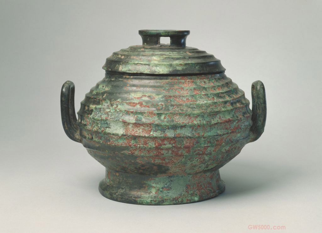 此簋敛口,鼓腹,器与盖有子母口相合,盖上捉手呈圈状,器腹两侧有附耳一对,圈足较低。通身饰瓦棱纹。