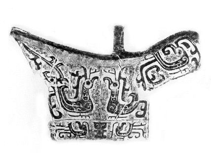 此爵倾酒用的流甚宽大,与流相对的尾尖锐,口与流之间有伞形柱一对。器腹呈杯形,一侧有兽首鋬,器下有三刀形尖足。器身装饰鸟纹。