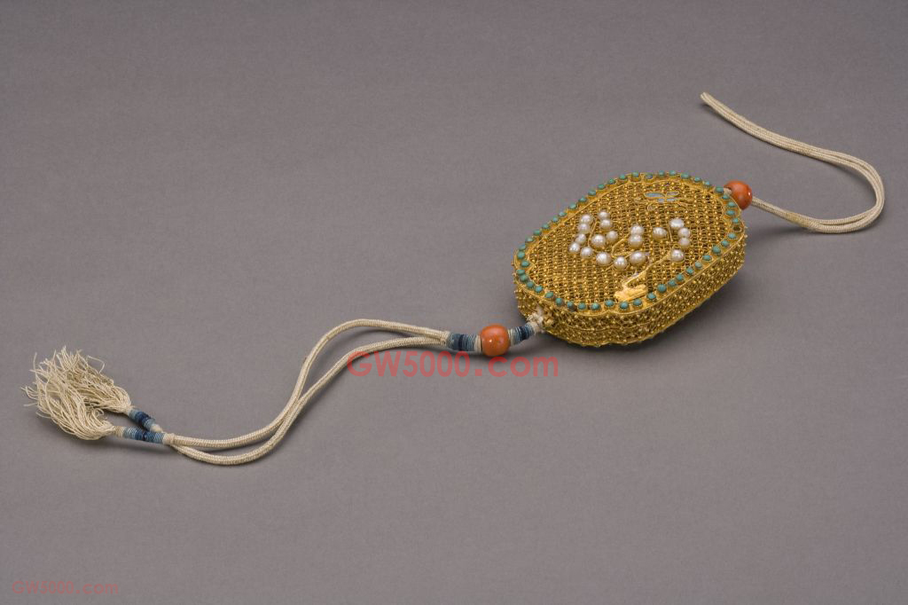 金嵌珠石累丝香囊,清,长7.1 厘米,宽5.2 厘米,厚1.4厘米。