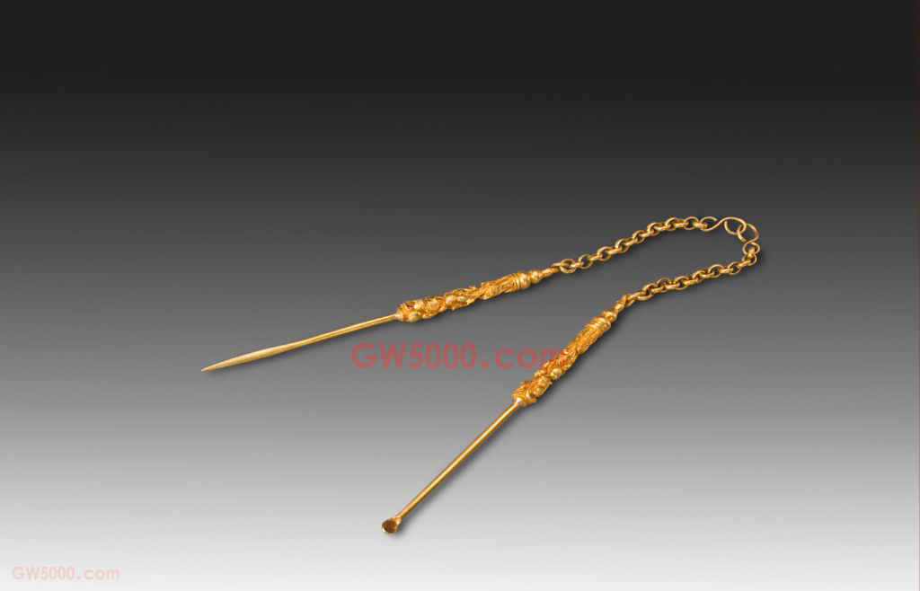 金葫芦万代纹带链牙签耳挖,清,通长8.2厘米。 指颜色金黄而略呈赤色的黄金制品。黄金因稀有而珍贵,但更为珍贵之处在于它本身所具有的其他金属所无法比拟的特点。它具有良好的稳定性,在空气中不氧化;它熔点高,一千多度的高温仍可保其夺目光辉;它具有良好的延展性、抗腐蚀性,并具有美丽光亮的颜色。故人们将其保值作用看得很重。中国习惯在金饰品上标注“足金”、“赤金”、“足赤”、“千足金”等等。“足”即足金,也就是纯金。“赤”即赤金,指成色好。实际上,足金与赤金的含金量只有99.99%,即所谓“金无足赤”。
