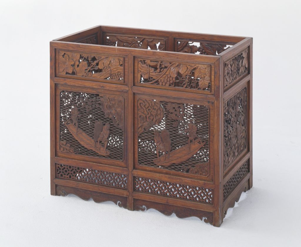 黄花梨镂雕捕鱼图树围,明,高94.4厘米,长109厘米,宽62.5厘米。 树围采用四面平做法,由四块长方形围板围合而成,四面镂空,每面分三层打槽,装绦环板。前后两块围板上层透雕葡萄纹;中间透雕捕鱼图,刻画渔夫摇橹、撒网的生动情景;下层为菱花式透棂。左右两块围板纹样与前后两块基本相同,只是中间为透雕花卉图。腿间有云头形壸门牙板,方腿直足。围板之间以活榫连接,可拆分成四块。 树围,又名护树围子,为庭院中护花木之用。此树围雕刻精美,为传世孤品。明清时期制作高档家具的木料品种之一。又称老花梨,黄檀属木类。我国海南岛有此树种,又名“海南檀”,现为国家一级保护植物。1.雕塑的表现手法之一,即在浮雕的基础上,为了生动地表现物象,局部圆雕,使其脱离背景,形成镂空。 2.瓷器装饰技法之一,也称“镂花”、“镂空”或“透雕”。将装饰花纹雕空,形成内外通透的图案。此技法出现在新石器时代陶器上,后在瓷器纹饰上广泛使用。 家具造型之一种,上下四面皆平直,故曰“四面平”。 镂空是瓷器的装饰技法之一,也被称作“镂花”或“透雕”。它是将器物胎体上的纹样镂通,形成内外通透的图案。 在家具的板心或其它构件上浮雕或彩绘方形或圆形的绦线,称为绦环。传统家具上的一种构件,常用于柜门的板心,屏风的上眉板、腰板和下裙板上。其作法是沿边框里侧于板心浮雕一周突起的棱线,并保持与边框平行。突起的线纹由于四角相连成方环状,犹如衣服上的绦边,故曰“绦环板”。 雕刻技法之一。一种是在浮雕的基础上镂空背景部分,有单面雕、双面雕之分。另一种介于圆雕和浮雕之间,常用于民间床、窗、梁、护板的雕刻中。 葡萄本非中国内地所产,系由西域传来。《齐民要术》曰:“汉武帝使张骞到大宛,取葡萄实,如离宫别馆旁尽种之。” 葡萄纹在内地图案装饰艺术中最早见于东汉,到了唐代,葡萄纹在工艺美术领域里已普遍流行。葡萄蔓延的枝条和丰硕的果实象征着“富贵长寿”,深受人们的喜爱。 古建筑彩画绘画的一种题材。清代中期之前多画绿叶子花卉,清代晚期画黑叶子花卉。宫内小巷道称壸(音捆),此处为家具术语之一。通常在横牙正中开一尖口,再向两侧曲线延伸与竖向牙条相交,此种作法称为劵口;如果牙条四面相交,则每面正中均开尖口,此种作法称为圈口;如果只有一面横牙条作出壸门装饰,则称为壸门牙子。家具部件名称。一般指面框或束腰下设置的连接于两腿之间的部件。设在其它部位的一般称为牙条。