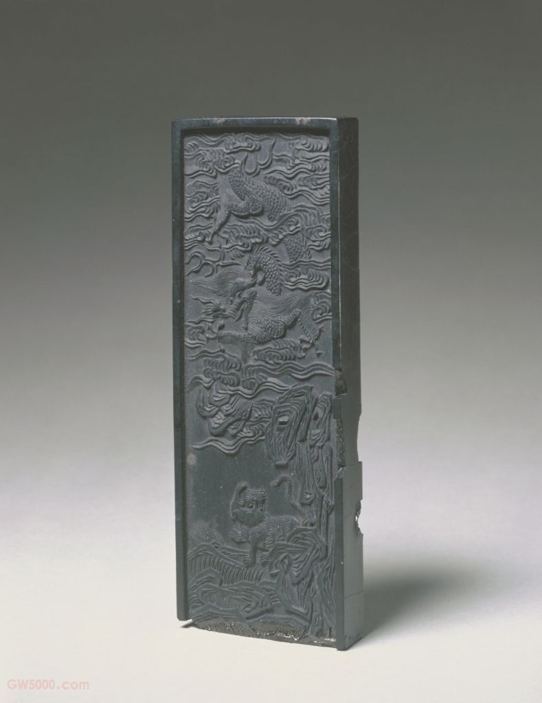 墨长方形,正、背面均凸起边框,正面雕龙、虎相遇图,背面题阴文楷书“风云际会”四字,“风”、“际”二字填金,“云”、“会”二字填蓝,四字下有阳文楷书“徽(州)婺(源)叶向荣监制”款。