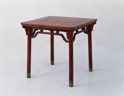 明,高86厘米,边长90厘米。 桌面宽边攒框,双拼面心,冰盘沿下另加垛边。桌面下有窄长的牙条,两端为浮雕卷草纹的牙头,与桌面四角下的卷草牙头组成“一腿三牙”式。牙条下安高拱罗锅枨,两朵如意云头卡子花与桌牙相连。牙、枨边均起阳线。四腿瓜棱式,方中略带圆。侧脚收分明显,稳重大方。“一腿三牙罗锅枨”是明代方桌的流行样式之一。明清时期制作高档家具的木料品种之一。又称老花梨,黄檀属木类。我国海南岛有此树种,又名“海南檀”,现为国家一级保护植物。中国古代家具上用攒边方法做成的框称为攒框。桌面侧沿常见的线角装饰,从侧面看通常为圆弧形边下出短直线边。为增加面沿厚度而贴在桌面边沿下的木条。在套箱的内箱和外箱之间起分隔、固定作用的木条也称垛边。很多家具在立木与横木的支架交角处多运用形式不同的牙子来装饰。这种牙子中长而直的称为牙条。在平面上雕出凸起的纹饰或物象的一种雕塑。按凸起高度的不同,可分为高浮雕、深浮雕、浅浮雕等,也有几种雕刻技法结合使用的形式,多见于高精繁杂的雕刻作品。 瓷器纹饰,又称卷叶纹或卷枝纹,宜于作各种器物的辅助纹饰。 17、18世纪传入中国的一种装饰花纹。俗称西蕃莲,如果没有花朵,则称为卷草。较短或较小的牙子俗称“牙头”。每条腿上有三道牙子,称为“一腿三牙”。高拱,字肃卿,河南新郑人,嘉靖二十年(1541年)进士。嘉靖三十一年(1552年)为裕王邸讲官,后拜太常寺卿,掌国子监祭酒。嘉靖四十一年(1562年)擢礼部左侍郎,后进礼部尚书,召入直庐。嘉靖四十五年(1566年)拜文渊阁大学士入阁。穆宗即位,进少保兼太子太保,以大学士兼掌吏部事。穆宗朝政革弊施新,多与高拱策略相助有关。高拱死于万历初年。 中国古代家具术语。凡两端低中间高形如罗锅的枨子皆可称为“罗锅枨”,而罗锅枨中部向上高拱直抵桌面的枨子称为“高拱罗锅枨”。古代家具中凡两端低中间高,形如罗锅的枨子皆可称为“罗锅枨”。镶在两根横木中间的雕有各种纹饰的构件。 苏式彩画中的基本图形之一。位于箍头与包袱之间,靠近箍头,偶见于檩枋中部。由如意图案演变而来,多以卷草纹方式组合,图形多变,如“万”字卡子、“寿”字卡子、夔龙卡子等。各种卡子均可分为硬卡子与软卡子式样,线条直硬者称硬卡子,柔曲者称软卡子。指家具腿足下端向外叉开。