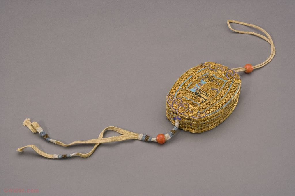 金累丝博古纹花囊,清,高2 厘米,长7.8 厘米,宽5.7厘米。点翠工艺十分复杂,先以金属制成特定的架子,用金属线勾勒出图案纹样,然后在线条间的凹陷处粘贴翠鸟的羽毛。用点翠工艺装饰的器物色彩鲜艳,精美华丽。