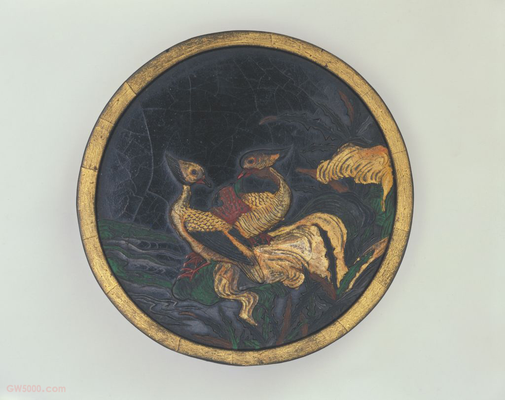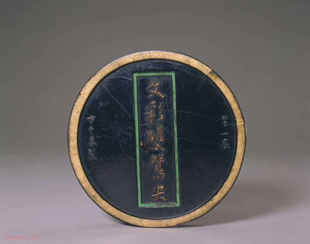 方于鲁文彩双鸳鸯墨,直径9.6厘米,厚1.6厘米。 墨圆形,周围凸起边棱,涂金。一面中央凸起长方形栏,栏内涂金阳文行书“文彩双鸳央”五字;栏外左侧近边缘处阳文楷书“方于鲁制”名款,右侧阳文“画一星”三字。另一面雕双鸳鸯,红、绿、金三色彩羽,立于江岸礁石上,头尾交错,相互凝视。墨之侧边,镌阳文楷书“大国香”三字。 此墨收录于《方氏墨谱》第二卷《国华》第五十四款,为方于鲁传世彩墨,墨模雕刻精致,墨质坚莹,是方于鲁墨品中的典型之作。 明初,墨上有施金彩者,但不多见。万历时期,墨上施金错彩之风开始盛行,反映了当时崇尚豪华的社会风气。方于鲁(1541-1608),初名大滶,字建元,徽州歙县人,明代万历年间著名制墨家。早年从程君房学制墨,得其制墨真谛,始于徽州独立经营墨业。曾以“于鲁”铭款墨,进献朝廷,博得皇帝赞赏,遂更“于鲁”为名。著有《方于鲁墨谱》(分列国宝、列国华、列博古、列博物、列法宝、列鸿宝六卷),取象立义,收录自制墨六品,计385式。 方氏制墨,多用油烟,配以各种名贵药料,墨质纯净,光洁细腻,被世人视为珍品。篆刻的一种方式,即把印文镌成凸状,在纸上钤盖时印文是红色,因而又称为朱文。 明代常见的墨品名。 制墨用的工具,又名墨印、墨范。一般用木料(石楠木)雕绘而成。从实用功能讲,墨模是为制墨而用,处于附属地位,但从艺术角度看,墨模雕刻本身即具极高的观赏性,具有独立的审美价值。凡墨模雕刻为阴文,塑成的墨则为阳文,反之墨模雕刻为阳文,塑成的墨则为阴文。墨模在雕刻技法上有线刻、浮雕及圆雕数种,型制样式上多种多样,务求精工。