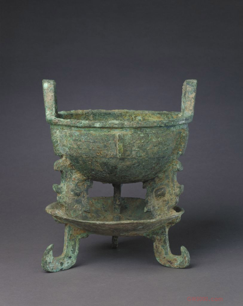 在以往的考古发掘品和传世藏品中,带盘鼎较少见。此种形制的鼎在陕西省宝鸡市茹家庄西周墓中曾出土一件。又名灶鼎。鼎下有托盘用于盛放炭火,类似于今天的暖锅、火锅。青铜器中的盘一般为承水器,多与匜、盉配合使用。其用法据《礼记·内则》载:“进盥,少者奉槃(盘),长者奉水,请沃盥,盥卒授巾。”沃盥,即洗手,以匜或盉浇水于手,盘则用来承接弃水,宴飨前后行之,也称“沃盥之礼”。此盘形体颇大,也可作盛水之用。青铜器中的盘最早出现于商代早期,战国时逐渐消失。