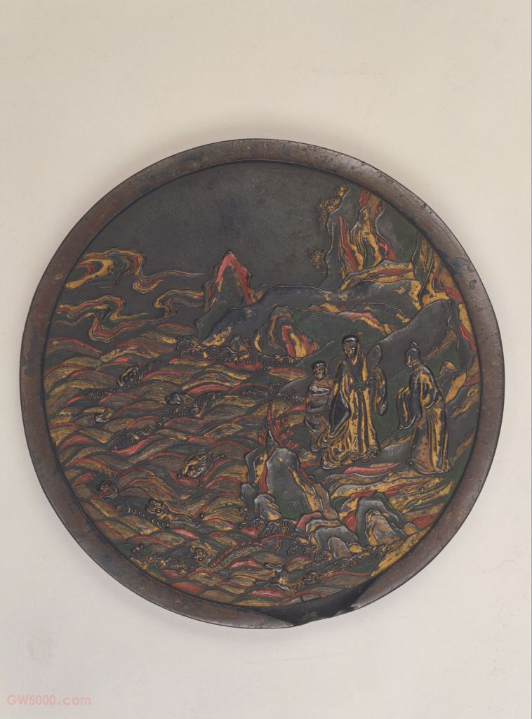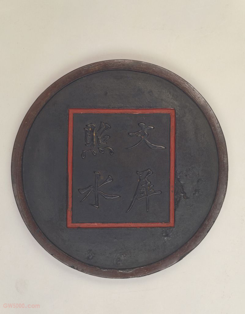 墨圆形,两面均凸起边棱,髹紫漆边。一面浮雕文犀照水图,并涂金,加红绿彩。一面凹入的朱漆方框内有阳文楷书“文犀照水”四字。墨一侧边有“万历辛丑方于鲁造”款,另一边为阳文楷书“菉竹居监造”款。