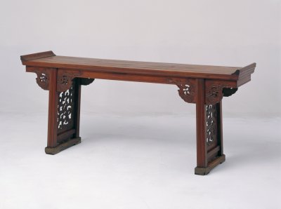 明,长225厘米,宽53厘米,高91厘米。 案面两端翘头,侧沿打洼。牙条、牙头一木连作,牙头透雕夔凤纹,以夹头榫结构与案腿连接。案腿方直,外侧一面正中饰双皮条线,两侧饰混面单边线。侧腿当中镶绦环板,双面透雕夔凤纹。足下带托泥,托泥开壸门亮脚。侧脚收分明显。 此案庄重中见精雕细作,显露出高贵的皇家气派。据清宫内务府档案记载,此为重华宫之物。桌面四边垂直的部分称侧沿。 1. 家具工艺术语。家具线脚起阳线而又在其正中做出凹面的称作“打洼”。两道并列称“双打洼”,一道的称“单打洼”。<BR> 2. 一种玉器制作的工艺手法,一般采用打磨减地方式做出凹沟似的造型。 很多家具在立木与横木的支架交角处多运用形式不同的牙子来装饰。这种牙子中长而直的称为牙条。较短或较小的牙子俗称“牙头”。在家具制作中,家具的两部分不用两块木料拼接,而用一块木料制作,称“一木连作”。 雕刻技法之一。一种是在浮雕的基础上镂空背景部分,有单面雕、双面雕之分。另一种介于圆雕和浮雕之间,常用于民间床、窗、梁、护板的雕刻中。 家具术语。牙条与牙头一木连作,在腿上端开出向上的豁口,牙条里侧开槽,将槽口对准腿上的豁口压下去,把牙条夹在两腿之间,这种结构称之为“夹头榫结构”。案形结体家具的基本制法之一。腿上端出榫并开口,中夹牙条、牙头,出榫与案底面的榫眼接合。明清家具线脚之一,为一种较宽的线条,顶部打洼,通常两条成组使用。传统家具构件上线脚造型之一种,即高起的素凸面。明清家具装饰手法之一。家具的方腿一侧起线,其余做成素混面,称“混面单边线”。在家具的板心或其它构件上浮雕或彩绘方形或圆形的绦线,称为绦环。传统家具上的一种构件,常用于柜门的板心,屏风的上眉板、腰板和下裙板上。其作法是沿边框里侧于板心浮雕一周突起的棱线,并保持与边框平行。突起的线纹由于四角相连成方环状,犹如衣服上的绦边,故曰“绦环板”。传统家具上承接腿足的部件。明清家具中有的腿足不直接着地,另有横木或木框在下承托,此木框即称为“托泥”。有的托泥之下还有小足,小足才是真正落地的部位。此部件多见于条案、几类等传统家具,以增稳重之感。宫内小巷道称壸(音捆),此处为家具术语之一。通常在横牙正中开一尖口,再向两侧曲线延伸与竖向牙条相交,此种作法称为劵口;如果牙条四面相交,则每面正中均开尖口,此种作法称为圈口;如果只有一面横牙条作出壸门装饰,则称为壸门牙子。常指攒框式椅背的下牙,牙板下缘锼出各式镂空曲边,俗称“亮脚”。指家具腿足下端向外叉开。