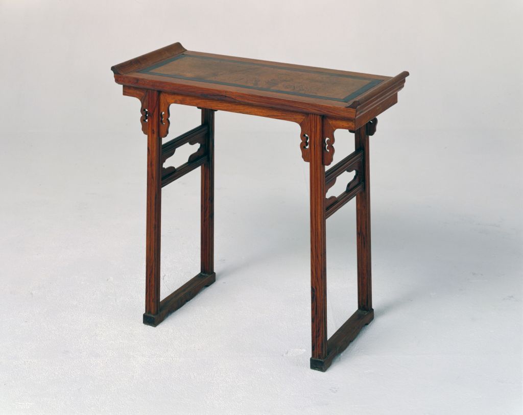 明,长120厘米,宽41厘米,高80厘米。 案面两端翘头,案面侧沿打洼。面心边框内镶子框,子框内镶瘿木板心。直牙条,牙头开蝠纹透孔。方直腿,外侧一面的正中刻凹线,两边饰双打洼线条,两侧面与内面饰单打洼线条,四角倒棱。侧腿间装双横枨,枨四面打单洼,四角倒棱,枨间镶海棠式开光洞。足下踩托泥。此案小巧精致,做工讲究,体现了明代家具的典型风格。