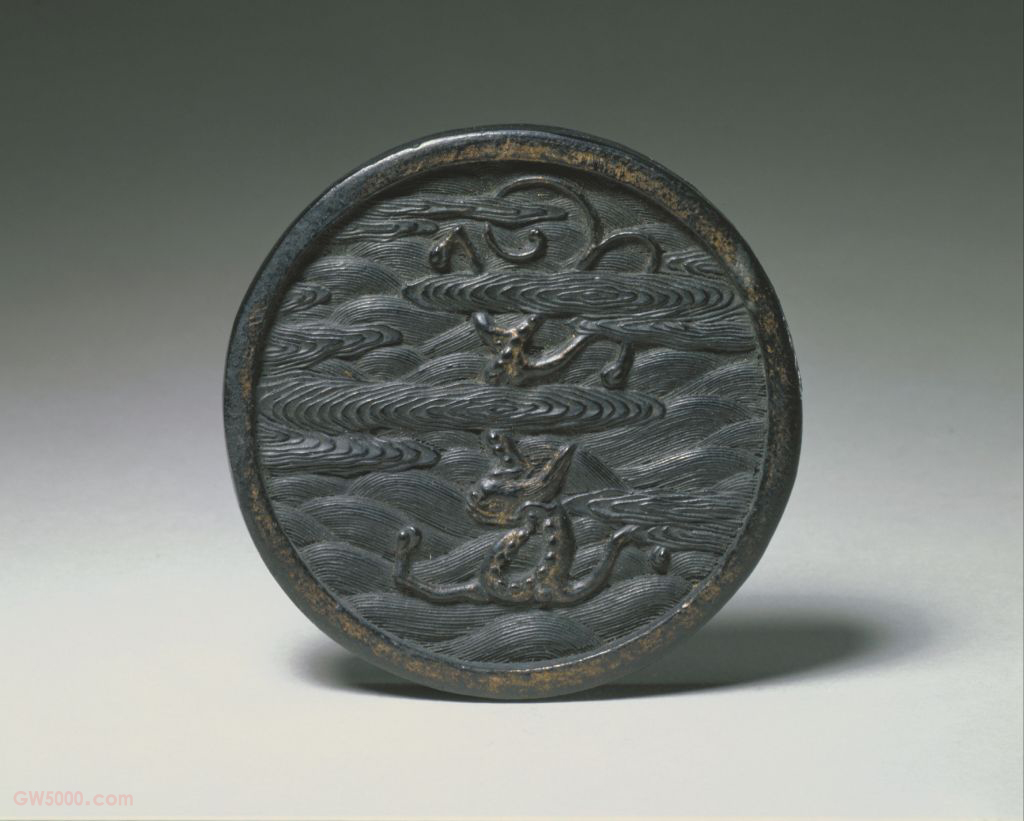 墨圆形。墨饼两面均凸起边框,墨面雕刻一条螭龙升降于云水间,墨背题阳文篆书“玄玉”,墨侧题“嘉靖庚子晴川江正制”。