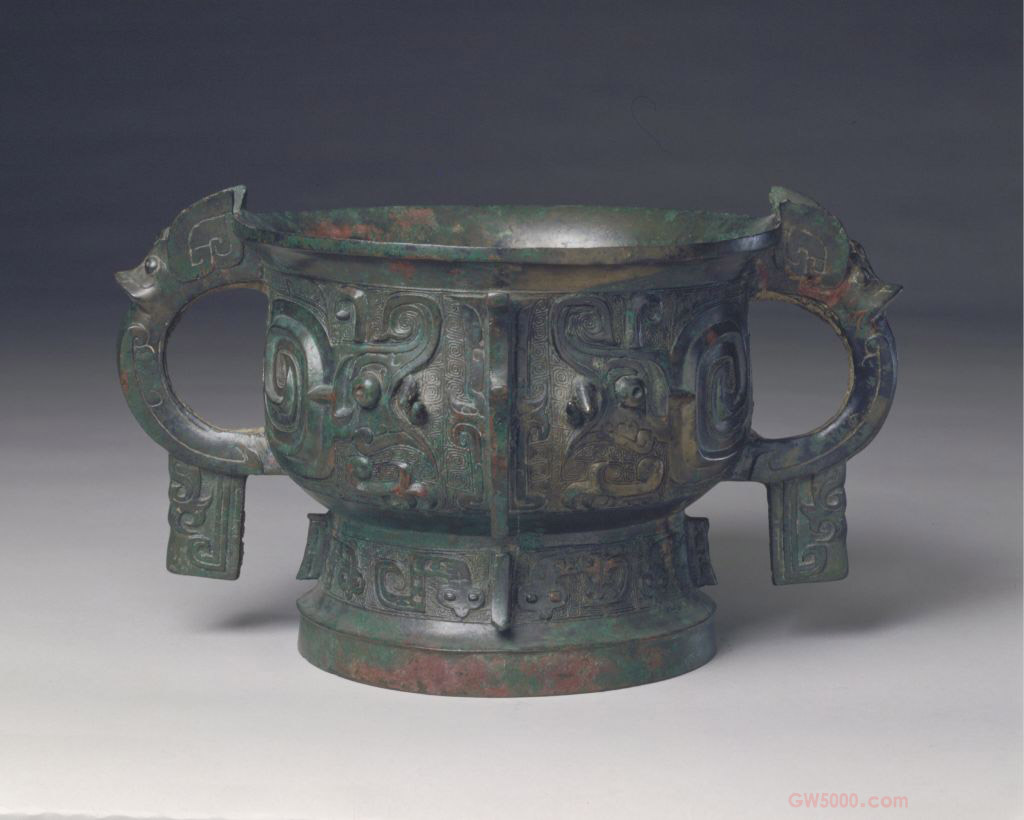 此簋侈口,圆腹,圈足。腹有二兽耳垂珥。腹饰浮雕团龙纹。龙张口,双齿外露,鼻上卷。龙纹两两对峙。圈足饰弓身卷尾蚕纹。通体以细云雷纹填地。一种身尾卷曲的龙形纹样。此纹饰仅见于西周早期的青铜器上,它存在的时间较短,是青铜器断代的重要依据。陶瓷器装饰纹样之一种。明、清两代是陶瓷器以龙纹为装饰的全盛时期,主要采用釉上、釉下彩绘方法,亦有印花、刻划等工艺。龙的体态有较多变化,常见有云龙、戏珠龙、海水龙、螭龙、行龙、立龙、正面龙、侧面龙、夔龙等。簋(音鬼),古代盛食物的器具,自商代开始出现,延续到战国时期。《周礼·地官·舍人》:“凡祭祀,共簠『0025』”。古籍中多写作簋,而铜器自铭则常为『0025』。青铜簋器物造型形式多样,变化复杂,有圆体、方体,也有上圆下方者。早期的青铜簋跟陶簋一样无耳,后来才出现双耳、三耳或四耳簋。据《礼记·玉藻》记载和考古发现而知,簋常以偶数出现,如四簋与五鼎相配,六簋与七鼎相配。在平面上雕出凸起的纹饰或物象的一种雕塑。按凸起高度的不同,可分为高浮雕、深浮雕、浅浮雕等,也有几种雕刻技法结合使用的形式,多见于高精繁杂的雕刻作品。