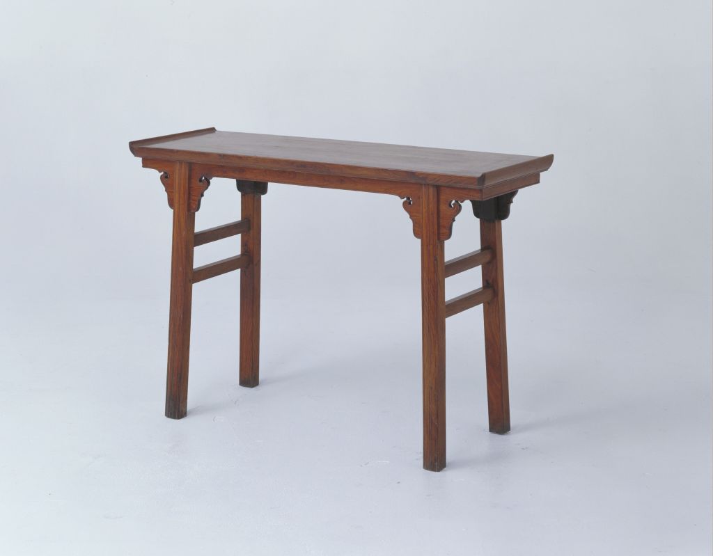 明,高80厘米,长120厘米,宽41厘米。 此案黄花梨木质。案面攒框镶板心,冰盘边沿,两端安装翘头。面下牙条与锼出的云纹牙头为一木连作,在牙条及云纹牙头边沿起阳线。牙条两端衔接牙堵成环匝。案腿上端打槽,夹着牙条、牙头与案面相交,此为夹头榫结构。腿子正面为双混面双边线。前后腿间装方材双横枨。 此翘头案无过多修饰,突出了明式家具简洁的特点,但不失做工考究。它带有明显的侧脚收分,体现了明式家具的稳重及造型的美感。明清时期制作高档家具的木料品种之一。又称老花梨,黄檀属木类。我国海南岛有此树种,又名“海南檀”,现为国家一级保护植物。中国古代家具上用攒边方法做成的框称为攒框。很多家具在立木与横木的支架交角处多运用形式不同的牙子来装饰。这种牙子中长而直的称为牙条。较短或较小的牙子俗称“牙头”。在家具制作中,家具的两部分不用两块木料拼接,而用一块木料制作,称“一木连作”。家具术语。牙条与牙头一木连作,在腿上端开出向上的豁口,牙条里侧开槽,将槽口对准腿上的豁口压下去,把牙条夹在两腿之间,这种结构称之为“夹头榫结构”。案形结体家具的基本制法之一。腿上端出榫并开口,中夹牙条、牙头,出榫与案底面的榫眼接合。 家具的一种线角形式。其中混面指高起的素凸面,而用三条边线界出两个混面即构成双混面双边线。传统家具构件上线脚造型之一种。家具方腿两侧起圆线,中间起弧形混面,统称“混面双边线”。传统家具构件上线脚造型之一种,即高起的素凸面。一般指断面为方形的木料。主要构件断面为方形的家具常称以方材制作。家具腿间用于连接两腿的横向构件。指家具腿足下端向外叉开。