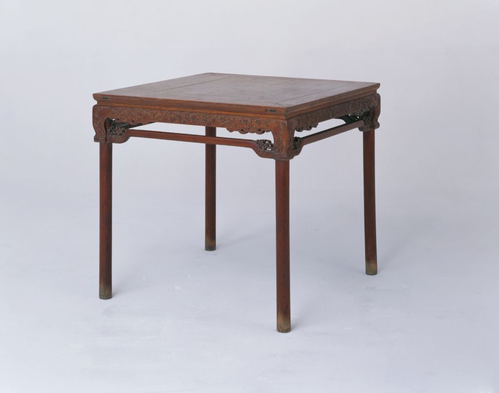 明,高86厘米,长93.5厘米,宽91.5厘米。 桌为黄花梨木质。桌面下有束腰,直牙条上浮雕梅花纹,两端镂出云纹。牙条下装罗锅枨,其新奇之处在于罗锅枨的两端本应挖掉的一部分木料被保留下来镂雕出一组梅花纹,既增强了装饰效果,又起到了加固作用。桌腿为拱肩展腿式,上部作三弯外翻马蹄形,下部作圆柱形,系仿照活腿桌的造型而制。 此桌用材考究,尤其四条展腿需用很大的木料才能做出,做工精细,为明式家具中的上乘精品。明清时期制作高档家具的木料品种之一。又称老花梨,黄檀属木类。我国海南岛有此树种,又名“海南檀”,现为国家一级保护植物。束腰,明清家具部件名称。原是须弥座上枭与下枭之间的部分,在家具上指面框和牙条之间缩进的部。束腰是我国传统家具造型的典型式样之一。很多家具在立木与横木的支架交角处多运用形式不同的牙子来装饰。这种牙子中长而直的称为牙条。在平面上雕出凸起的纹饰或物象的一种雕塑。按凸起高度的不同,可分为高浮雕、深浮雕、浅浮雕等,也有几种雕刻技法结合使用的形式,多见于高精繁杂的雕刻作品。 古代家具中凡两端低中间高,形如罗锅的枨子皆可称为“罗锅枨”。1.雕塑的表现手法之一,即在浮雕的基础上,为了生动地表现物象,局部圆雕,使其脱离背景,形成镂空。 2.瓷器装饰技法之一,也称“镂花”、“镂空”或“透雕”。将装饰花纹雕空,形成内外通透的图案。此技法出现在新石器时代陶器上,后在瓷器纹饰上广泛使用。 有束腰的家具腿上端由于束腰缩进而形成的肩膀称为“拱肩”。一木连作两层腿,或短腿下另接活腿以增加高度的作法俗称“展腿”。明清家具的腿足装饰,足端向外翻的称“外翻马蹄”,向里翻称“内翻马蹄”。