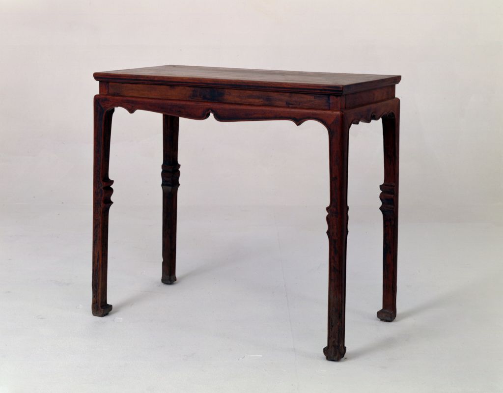 明,高88厘米,长99.5厘米,宽51.5厘米。 桌通体黄花梨木质,面下高束腰,束腰板条不包腿,四角露出桌腿的上节。桌正面做有一个抽屉。壸门式牙条,边缘起线与腿交圈。桌腿中部向内的两侧饰云纹翅,直腿内翻马蹄足。 此桌造型美观,尤其在其束腰部位做一抽屉,这在明代家具中尚属少见。明清时期制作高档家具的木料品种之一。又称老花梨,黄檀属木类。我国海南岛有此树种,又名“海南檀”,现为国家一级保护植物。束腰,明清家具部件名称。原是须弥座上枭与下枭之间的部分,在家具上指面框和牙条之间缩进的部。束腰是我国传统家具造型的典型式样之一。宫内小巷道称壸(音捆),此处为家具术语之一。通常在横牙正中开一尖口,再向两侧曲线延伸与竖向牙条相交,此种作法称为劵口;如果牙条四面相交,则每面正中均开尖口,此种作法称为圈口;如果只有一面横牙条作出壸门装饰,则称为壸门牙子。很多家具在立木与横木的支架交角处多运用形式不同的牙子来装饰。这种牙子中长而直的称为牙条。中国古代家具术语。桌腿上做出高于平面的云纹,形似翅膀,称作云纹翅。明清家具的腿足装饰,足端向里翻称“内翻马蹄”,向外翻称“外翻马蹄”。
