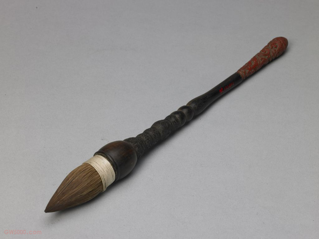 提笔直管无帽,笔管饰红、酱色雕漆并拼以紫檀木,紫檀斗,笔锋为貂毫竹笋式。此笔反映了明嘉靖年间雕漆的风格。  髹漆工艺之一,亦称刻漆。其工艺技法是在胎体上层层髹漆,少则几十层,多则百层以上,然后在漆上雕刻花纹。其胎以木质居多,漆色有红、黄、绿、酱等。