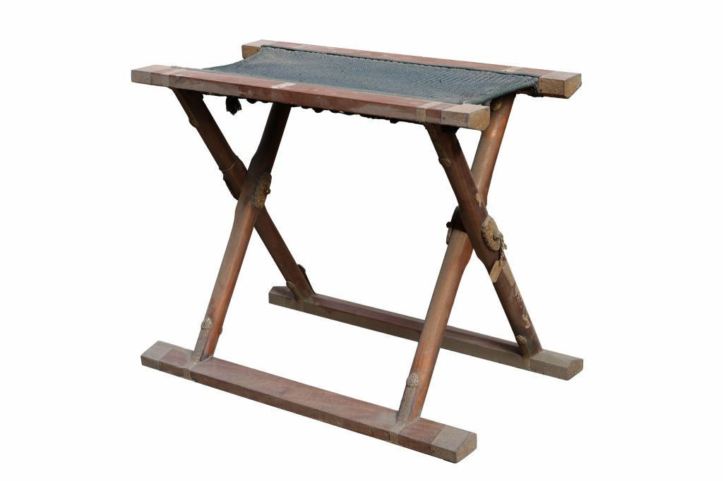 明,横29厘米,纵66厘米,高55厘米 此交杌为黄花梨木质,杌面用蓝丝绒织成回纹软屉。着地的两根横材底平而宽,可以摆放平稳。凡横材出头处均用鋄金铁叶包裹,并用钉加固。轴钉穿铆处加护眼钱。此交杌为宫廷用具,系皇帝出游时所使用,因此制作十分考究。交杌(音物),古称“胡床”,今通称“马扎”。明清时期制作高档家具的木料品种之一。又称老花梨,黄檀属木类。我国海南岛有此树种,又名“海南檀”,现为国家一级保护植物。家具上常用的纹饰之一,由陶器和青铜器上的雷纹衍化而来,寓意吉利深长,苏州民间称之为“富贵不断头”。在家具上,回纹主要作为边饰,用于边框、牙条、足端或束腰等处。家具上大量采用回纹见于清代。用棕藤、丝绒或其它纤维编织的家具屉面。安装在轴钉帽与家具之间的金属片,一般为圆形,以防磨损钉眼及家具表面。