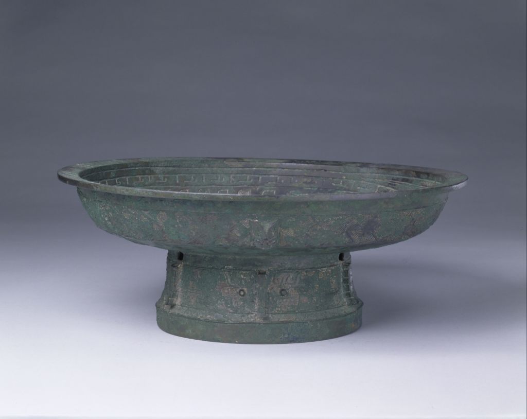 青铜器中的盘一般为承水器,多与匜、盉配合使用。其用法据《礼记·内则》载:“进盥,少者奉槃(盘),长者奉水,请沃盥,盥卒授巾。”沃盥,即洗手,以匜或盉浇水于手,盘则用来承接弃水,宴飨前后行之,也称“沃盥之礼”。此盘形体颇大,也可作盛水之用。青铜器中的盘最早出现于商代早期,战国时逐渐消失。青铜器中的盘一般为承水器,多与匜、盉配合使用。其用法据《礼记·内则》载:“进盥,少者奉槃(盘),长者奉水,请沃盥,盥卒授巾。”沃盥,即洗手,以匜或盉浇水于手,盘则用来承接弃水,宴飨前后行之,也称“沃盥之礼”。此盘形体颇大,也可作盛水之用。青铜器中的盘最早出现于商代早期,战国时逐渐消失。