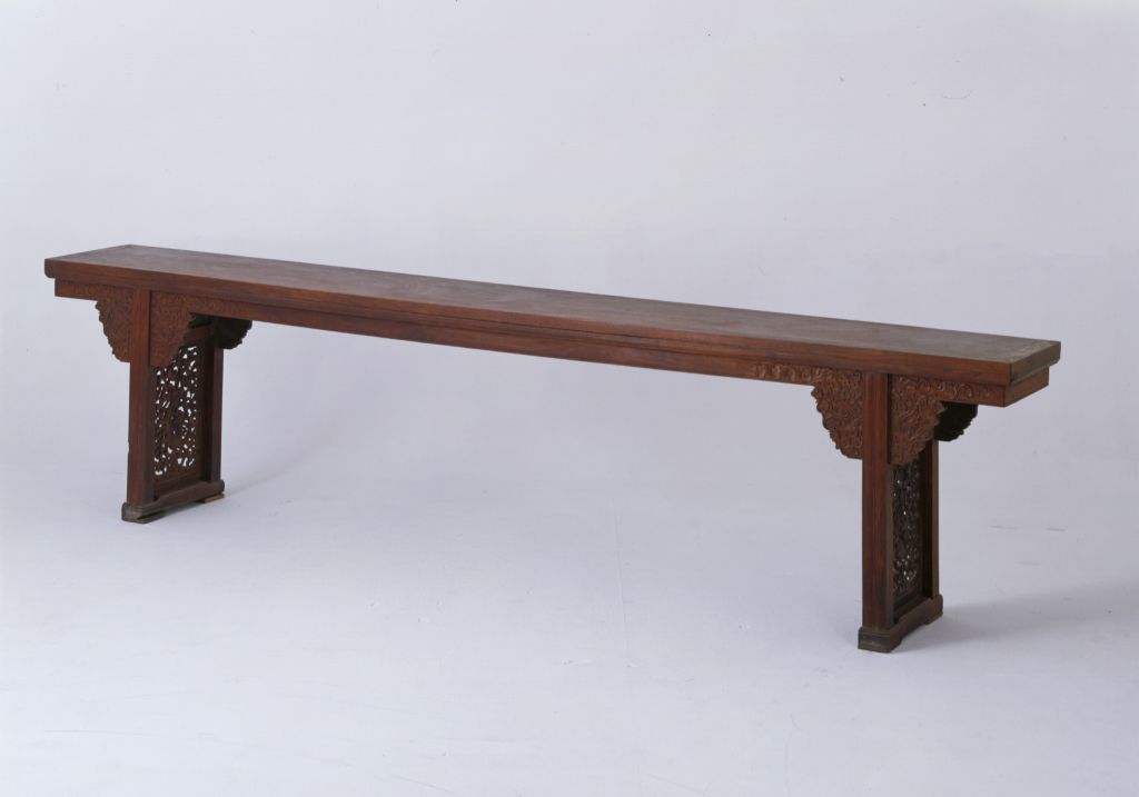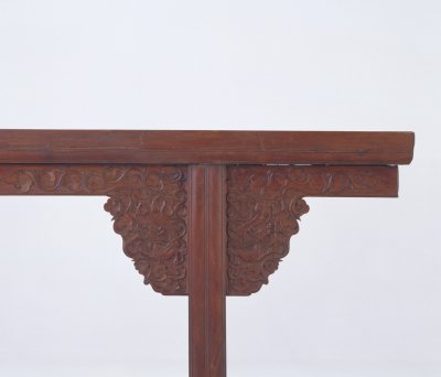 明,高89.5厘米,长359厘米,宽48厘米。 此条案黄花梨木制成,案面平直狭长,案面之下的案腿与案面夹头榫相接,直牙条,牙条两端雕出云形牙头,牙头处雕饰云龙纹。前后两腿间安横枨并镶装绦环板,上层雕云纹开光,下层透雕云龙纹。四条腿为方材直腿,腿中间起皮条线,前后两腿的足下承托泥。 此案体形硕大,雕工精美,为一件难得的大器。中国古代家具的一种。案面窄而长,案体较高。明清时期制作高档家具的木料品种之一。又称老花梨,黄檀属木类。我国海南岛有此树种,又名“海南檀”,现为国家一级保护植物。案形结体家具的基本制法之一。腿上端出榫并开口,中夹牙条、牙头,出榫与案底面的榫眼接合。很多家具在立木与横木的支架交角处多运用形式不同的牙子来装饰。这种牙子中长而直的称为牙条。较短或较小的牙子俗称“牙头”。陶瓷器装饰纹样之一种。明、清两代是陶瓷器以龙纹为装饰的全盛时期,主要采用釉上、釉下彩绘方法,亦有印花、刻划等工艺。龙的体态有较多变化,常见有云龙、戏珠龙、海水龙、螭龙、行龙、立龙、正面龙、侧面龙、夔龙等。家具腿间用于连接两腿的横向构件。在家具的板心或其它构件上浮雕或彩绘方形或圆形的绦线,称为绦环。传统家具上的一种构件,常用于柜门的板心,屏风的上眉板、腰板和下裙板上。其作法是沿边框里侧于板心浮雕一周突起的棱线,并保持与边框平行。突起的线纹由于四角相连成方环状,犹如衣服上的绦边,故曰“绦环板”。 我国传统装饰技法之一。即为使器物上的装饰变化多样或突出某一形象,往往在器物的某一部位勾勒出某一形状(如扇形、蕉叶形、菱形、心形、桃形、圆形等)的空间,其内饰以图纹。 雕刻技法之一。一种是在浮雕的基础上镂空背景部分,有单面雕、双面雕之分。另一种介于圆雕和浮雕之间,常用于民间床、窗、梁、护板的雕刻中。 一般指断面为方形的木料。主要构件断面为方形的家具常称以方材制作。明清家具线脚之一,为一种较宽的线条,顶部打洼,通常两条成组使用。传统家具上承接腿足的部件。明清家具中有的腿足不直接着地,另有横木或木框在下承托,此木框即称为“托泥”。有的托泥之下还有小足,小足才是真正落地的部位。此部件多见于条案、几类等传统家具,以增稳重之感。雕镂之工。