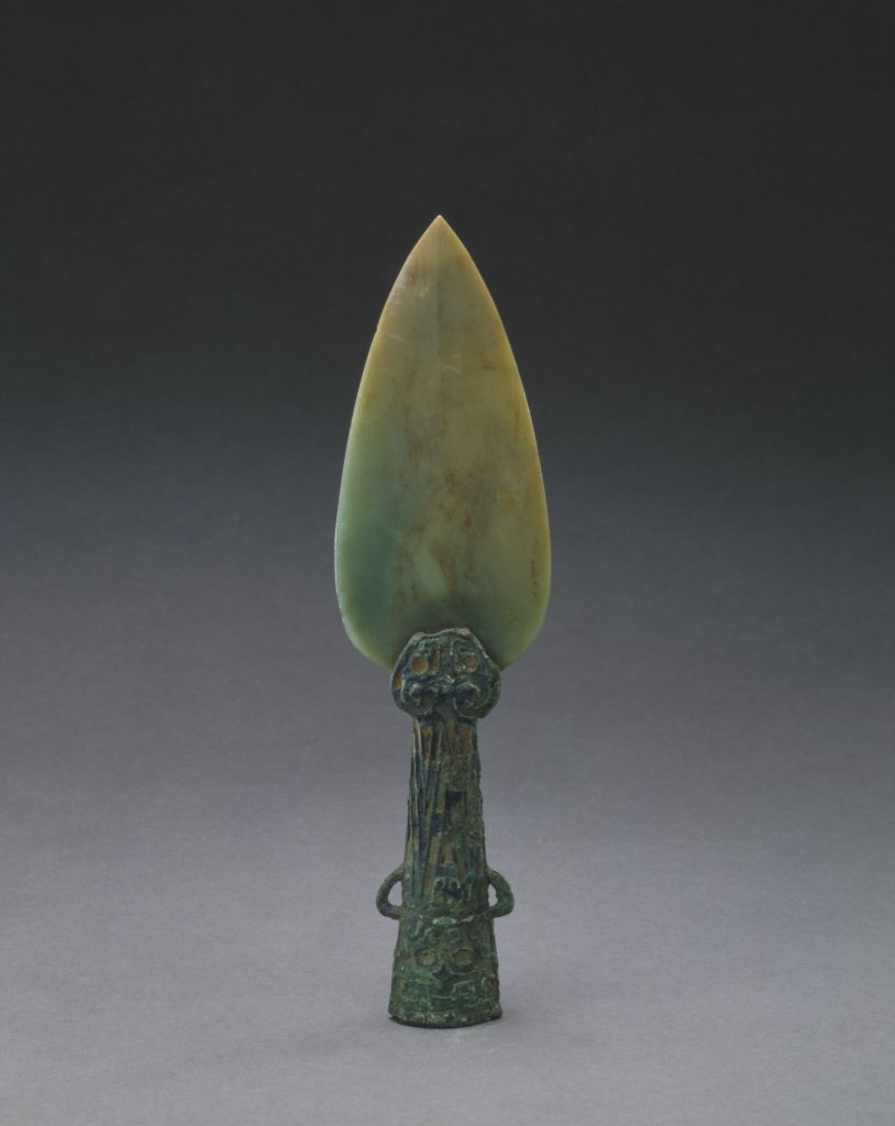 矛由青铜柄和玉刃两部分组成。柄呈锥状,中空,两侧各有一系,一端有銎,另一端为桃形,有槽,叶形玉刃镶嵌其上。柄饰兽面纹及叶形纹。