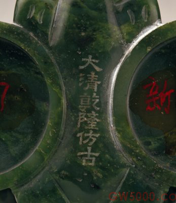 瓶碧玉质,立体圆雕。瓶身琢成双筒,蟠龙形顶盖。双筒间透雕飞鹰踏熊首像。瓶身上部饰谷纹,中部饰勾云纹,下部饰蝉纹。器底熊之腹部阴刻“大清乾隆仿古”隶书款。