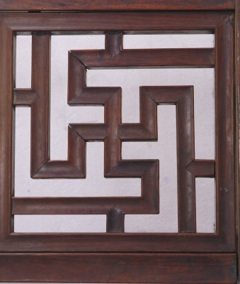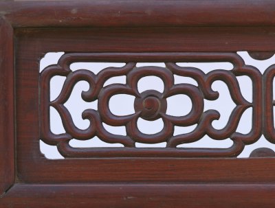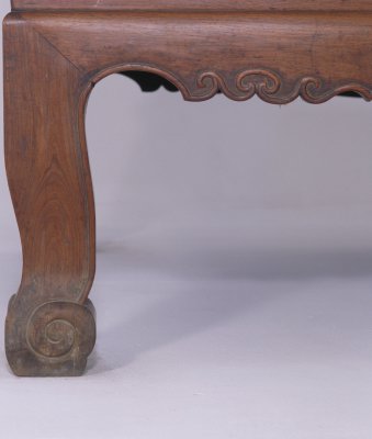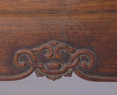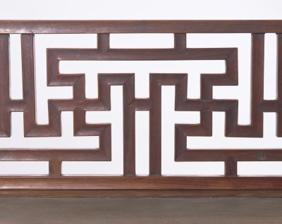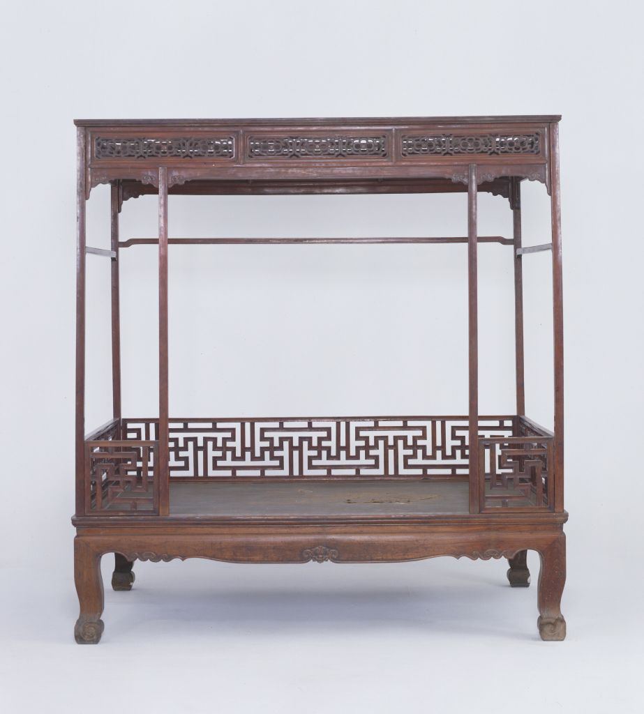 明,高231厘米,长218.5厘米,宽147.5厘米。 此床通体为黄花梨木制成,床面之上起六根床柱,正面四根,后面两根。六根立柱顶端安有挂檐,挂檐分段装绦环板,锼空雕饰如意云纹,挂檐上安顶架。挂檐下方与床柱之间装有牙板,六根床柱下安有低矮的透空床围板,均用短木料攒接成连续的“卍”字图案装饰,床面为席心,束腰之下的牙板为壸门牙板,牙板中有云纹卷曲分心花,四条腿为三弯腿,足端雕云纹蹄足。