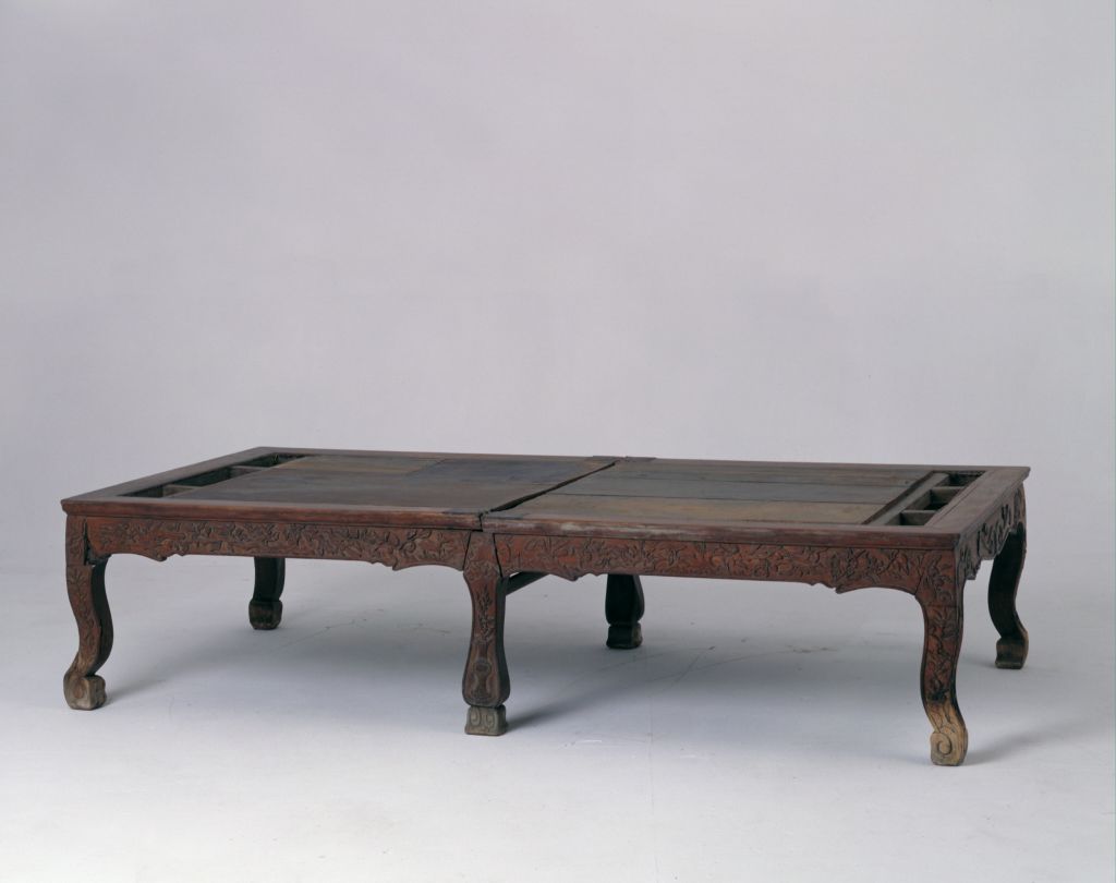 明,高48厘米,长207厘米,宽105厘米。 床身以黄花梨木制,床面无围,大边分两节,以合页连接,可以折叠。中间两腿做成花瓶式,并浮雕花瓶及珊瑚。上部为插肩榫,展开时与牙子吻合。四角弯腿,内翻云纹足,四角的腿足都可以向内及左右折叠。四腿及牙条浮雕折枝花鸟、双鹿、杂草等,具有浓厚明式风格。