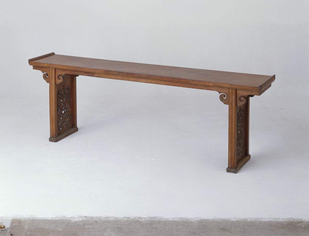 黄花梨翘头案,明,高81.5厘米,长244厘米,宽46厘米。 翘头案黄花梨木质。案面两端带小翘头,面下牙条、牙头与腿采用夹头榫结构,两侧牙头与当中牙条一木联作,牙头锼出卷云纹。边缘起阳线,腿面饰双混面双边线。两侧腿间镶档板,壸门式开光,当中透雕两面作双螭纹。足下装垫木托泥。案腿向两侧叉出较大,明式风格特点明显。此案形体长大,是传世黄花梨家具中罕见的大器。