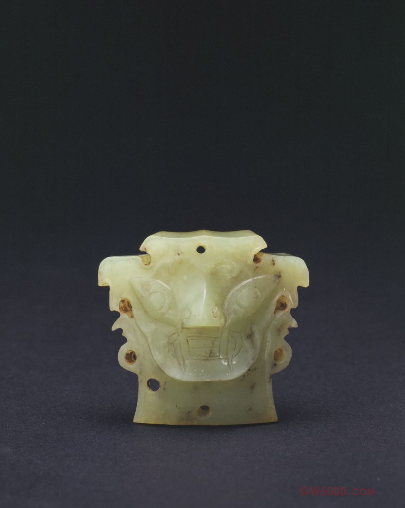 玉料青白。整体呈梯形,下部略窄,中部凸起,背面凹进。正面刻有凸起夸张但又具象的人面五官:枣核形眼,圆眼珠;三角形鼻高翘,上面琢有阴线纹饰;方形嘴,牙齿外露,并有一对獠牙;边缘有耳,耳垂部有孔。头上有冠。冠、颈部、右耳下各有一孔。
