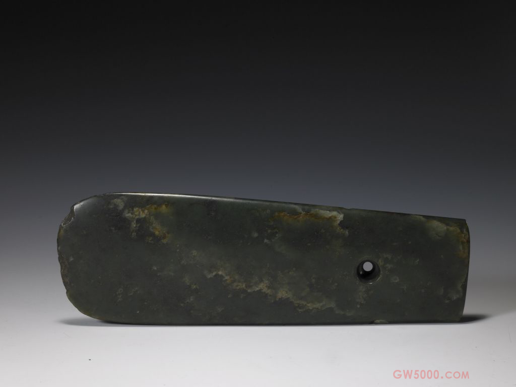 碧玉质,玉器表面有红褐色沁及白色沁。下边刃有磕缺。一端一孔,表面抛光。