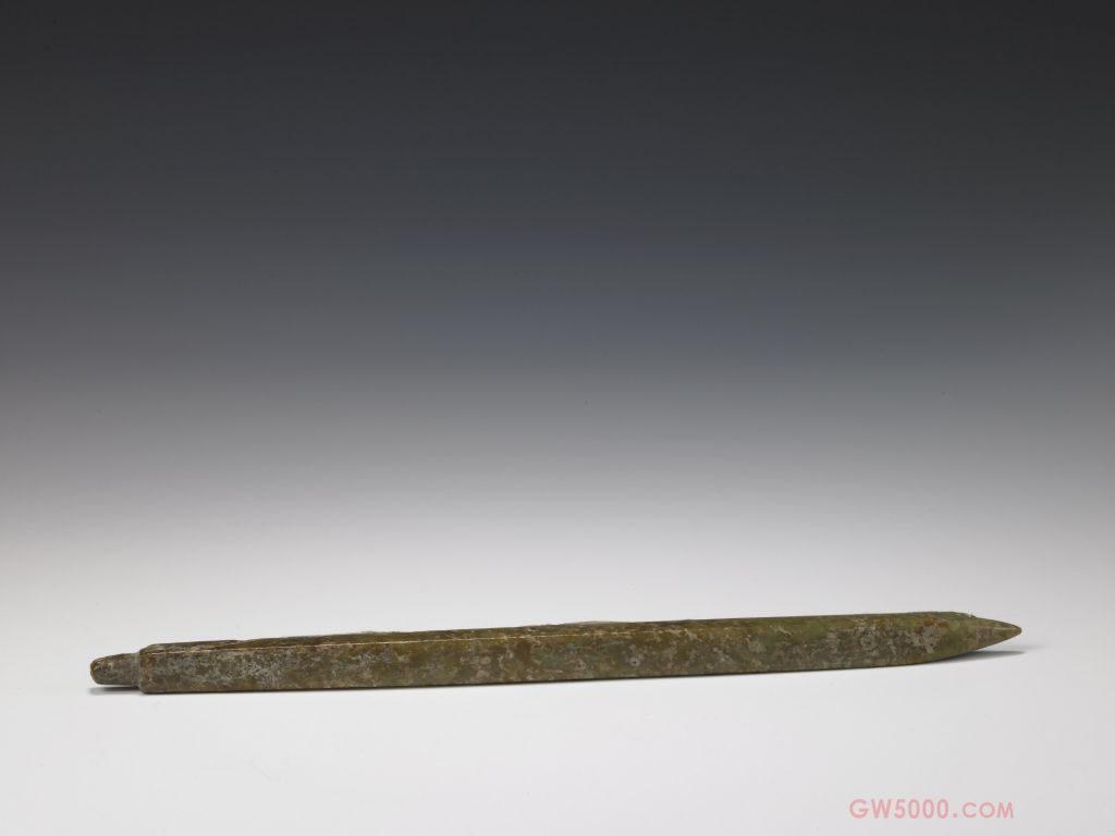 黄绿色玉质,表面有白色及黄褐色沁斑。呈四方柱形,尾端自然收尖,整体光素,顶端榫处原有对钻孔,因孔残断,已磨去。