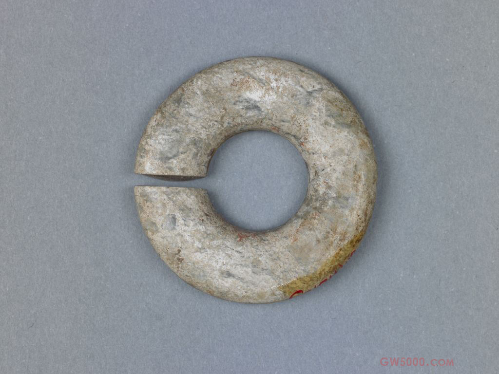 玉受沁为鸡骨白色,但透过灯光可见黄绿色的玉质。器为圆形,一侧有一缺口,两侧的边缘呈刃状。通体光素无纹饰。