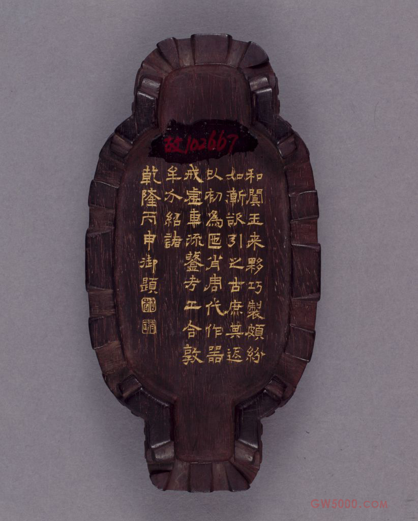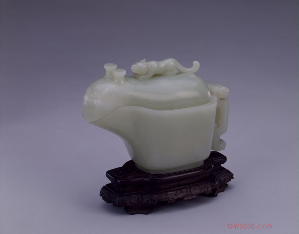 此器应作于乾隆二十五年(1760年)以后,当时新疆地区向清廷贡玉的数量大大增加,宫廷的玉器制作进入繁荣时期。乾隆皇帝大力推崇玉器的还淳师古,于是出现了许多仿古玉器,此件玉觥即其中一件,从所刻御制诗中可清楚地看到乾隆帝的制玉主张。诗中称此造型之器为“匜”沿袭古人对这种类型的青铜器的称谓。近人王国维《观堂集林·说觥》一文提出有盖作牛头形的彝器为觥,无盖为匜,这里权且参照王国维的说法(参见《中国青铜器》一书)。阴刻:将图像、文字以凹陷形式雕刻。紫檀木是世界上最名贵的木材之一,主要产于南北回归线之间的热带、亚热带地区,我国广东、云南等地有少量出产。其木质坚硬,体重,入水即沉,没有疤痕,呈紫黑色。紫檀木生长缓慢,非数百年不能成材,故极珍贵。紫檀木的纹理纤细浮动,变化无穷,其色调深沉,显得稳重、大方、美观。《博物要览》称:“新者色红,旧者色紫,有蟹爪纹,新者以水浸之,可染物。”我国古代使用紫檀木制作器物历史悠久,东汉末年已见于记载,唐代宫廷中亦有使用紫檀木的记载。至明代,紫檀木更是受到皇家的宠爱。清代,紫檀木大量进入宫廷中,为内务府造办处用于制作清宫家具及文玩之器的必备材料,同时一些富商大贾之家也多使用名贵的紫檀木制造家具及生活用品。