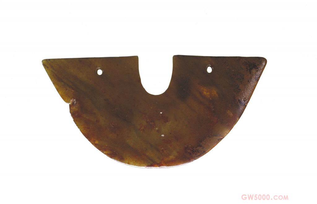 璜玉料材质较好,黄褐色,较薄。近似半圆形,直弦,中部下凹,两侧各有一孔,底部两角略向外伸。璜的一面有弧形凹槽,是对玉料开片时留下的切割痕,这类切割痕在新石器时代玉器上时有出现,从痕迹上可以看出,玉器加工中采用的是线切割的剖料方法。玉片厚度约0.3厘米,表明当时玉料开片技术已达到一定的水平。作品呈不规则的半圆形,两角外伸,说明此璜并非由圆形玉器切割而成,可能是以长方形或三角形玉片磨成。