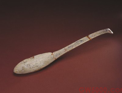 勺玉料呈灰白色,局部颜色因久埋而产生变化。此勺出土时断为数段。勺形窄而长,头部似舟,池部为下凹的弧形曲面,勺柄细长,近似片状,表面下凹,端部略宽,有一孔。