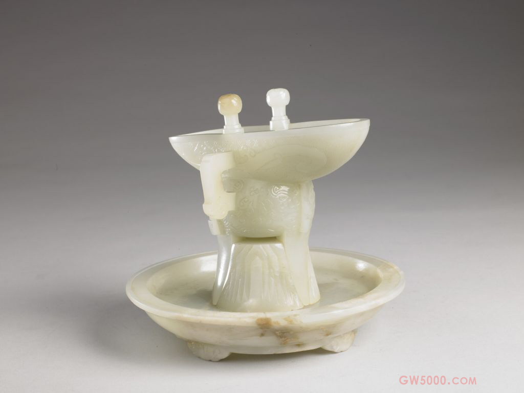 爵杯仿自商周青铜爵,所饰纹饰也多出自古彝器,但其下所具的托盘具有清代特点。清乾隆时期,在玉器、瓷器、珐琅等多种手工艺品中都可见到此种形制的仿古爵杯。夔,古代传说中一种奇异的动物,似龙,一足。《庄子·春秋》中记载:“夔谓蚿曰:‘吾以一足趻踔而行。’”夔纹即这种独脚龙的侧面图案。玉器上的夔纹,最早见于商、西周时期,多见于彝器上。夔纹在玉器上出现的时间很长,自商、周至今,一直在玉雕工艺纹饰中占据着重要地位,而在战国和汉代尤为兴盛。玉器上的夔纹线条比青铜器上的柔和,阴刻线除单线外,也有双刻线。