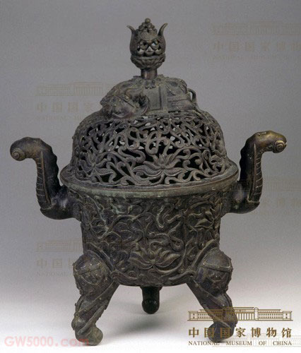 明代炼铜水平很高,产量及用量都很大。例如,永乐年间在湖北武当山兴建的金顶,高5.54米,进深3.15米,宽4.4米,其全部构件都是用铜预制而成的;在北京用铜铸造的觉生寺华严钟竟重达46.5吨。明朝宣德年间(公元1426~1435年)生产的铜熏炉,后代称为宣德炉,亦称宣炉。明宣宗朱瞻基认为当时典礼用的礼器与古制不合,下令工部查考秦汉礼器形制,并结合宋代官、汝、定、哥等瓷窑器物形制,更制礼器,供典礼及寺院用。宣德炉以优质铜铸造,造型古朴,端庄沉稳,款识隽永,以褐色、茄皮色、藏经色等为多,深得世人钟爱。这件云纹熏炉铜质优良,造型秀丽雅致,气势宏大,熏香效果极佳,并有楷书“大明宣德年制”款。