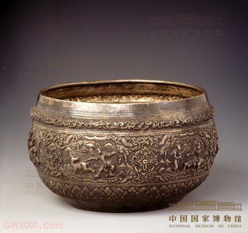 这是公元18世纪柬埔寨送给清政府的礼物。在柬埔寨,广为流传着许多历史传说故事和创世神话,如《金环蛇的故事》、《雷电的故事》、《蚊子的故事》,以及这件银钵上表现的《金鹿的故事》等。
