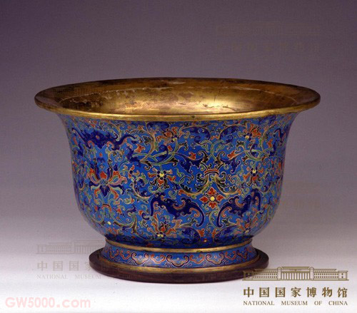 铜胎画珐琅器是以铜做出器胎,然后把珐琅质釉料填画在器物表面。铜胎画珐琅工艺在清代康熙、雍正、乾隆三朝获空前发展。这件铜胎画珐琅花盆,饰以蝙蝠、莲花纹饰。蝠莲纹是中国传统的吉祥纹饰之一。汉字中蝙蝠的“蝠”与幸福的“福”谐音,出淤泥而不染的莲花是花中的君子,“莲”又与连绵不断的“连”谐音,因而蝠莲纹就寓意幸福相连。