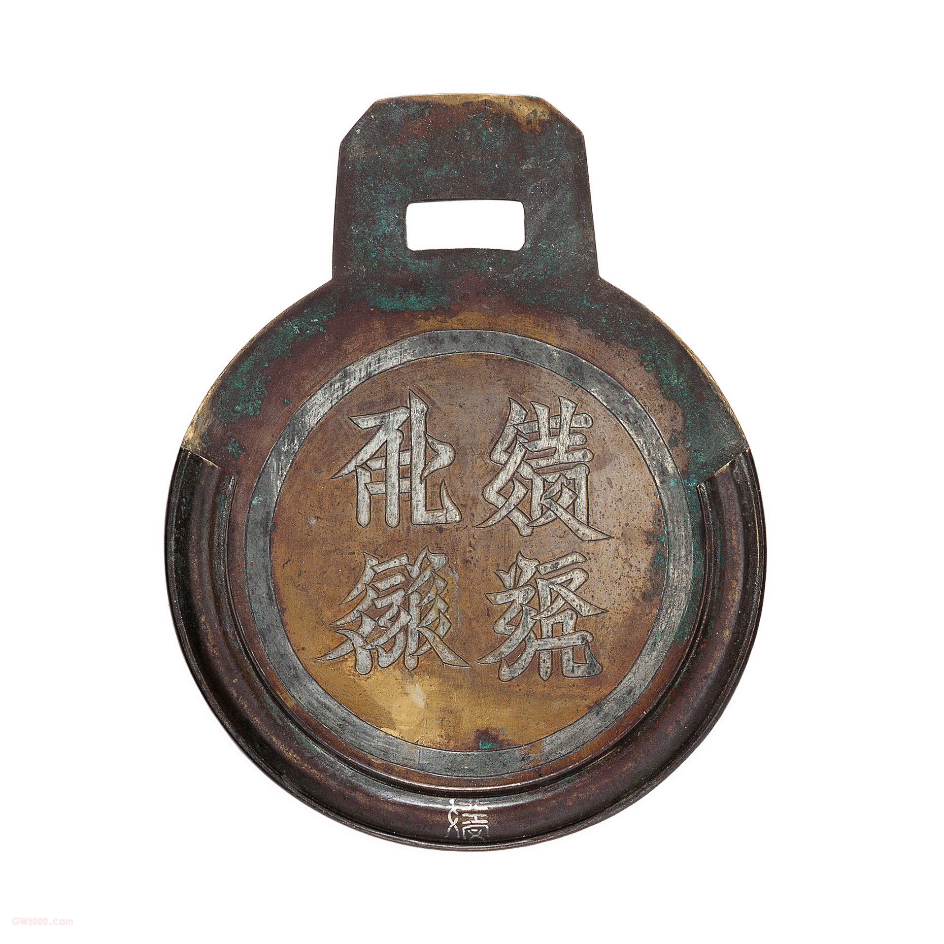 此敕牌为青铜质,由两个圆形青铜牌组成,以牙口咬合,两片之间形成空腔,上端附扁方形提钮。一片青铜牌外侧刻回曲花卉纹,纹内双线阴刻西夏文“敕”,另一片刻有四个西夏文字,译作“敕燃马牌”,意思是“敕令驿马昼夜疾驰”。