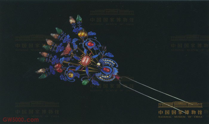 钗头凤形,两翼张开,翼下缀双排珠串,凤头顶饰珍珠,身饰红宝石。凤前花枝呈放射状,其上花朵三层,皆点缀宝石;凤身、花枝、花叶皆点翠饰。整枝花钗有鸟语花香之意。