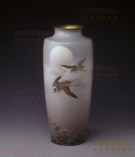 这是日本国赠送给清王朝的礼物。七宝又称七宝烧,是日本的一种传统工艺。它以贵金属为胎,外饰以石英为主体的原料及配制各种色料烧制而成,类似中国的金属胎珐琅工艺。七宝烧按其制作方法,可分为有线七宝烧和无线七宝烧。有线七宝烧为一种掐丝珐琅,类似中国的景泰蓝,但日本在工料和珐琅用料上又有其自身特点。无线七宝烧为画法琅的一种,它是用珐琅直接涂画在金属胎上,经过烧制后显色,富有画绘的特色,实际上就是中国的画珐琅。不过日本的无线七宝烧骨胎较薄,釉面平滑,有玻璃光泽感。此件绘有野菊飞鸟的七宝烧属于无线七宝烧。