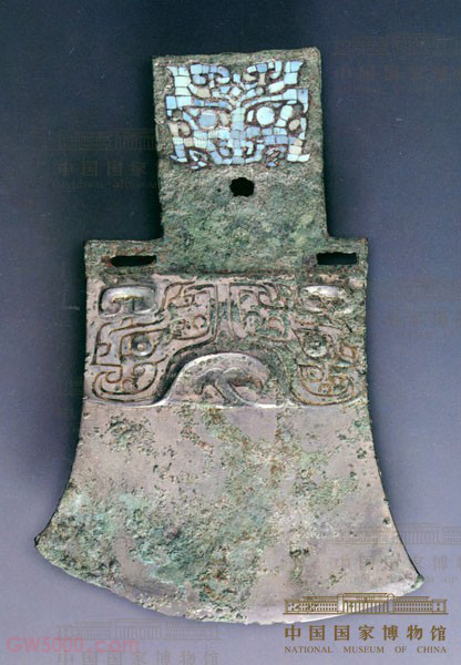在殷墟遗址中出土的铜钺大约有10余件,分为大、小两种。殷墟妇好墓中出土有2件大型钺,形状如斧,肩部有两个长方形穿,两侧有对称的血槽6对,因器身较大,不应是实用器。另外还出土了几件小型钺,这些器身较小的钺,一般为实用武器。而这件饕餮纹钺虽然体型较小,制作却异常精美,束腰、弧刃,上嵌绿松石组成的饕餮纹饰。