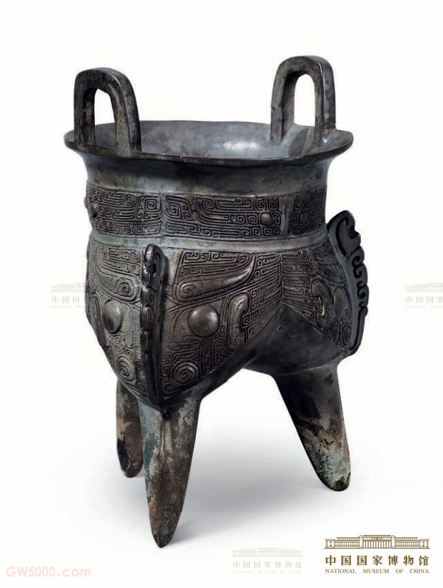 器立耳,敞口,口缘下呈直壁收束,颈部较高,三袋足较深,下承三空锥足。器颈部饰带状饕餮纹,线条清晰流畅。三袋足各饰一饕餮纹,“臣”字状目,角如牛,鼻梁上扉棱较高。