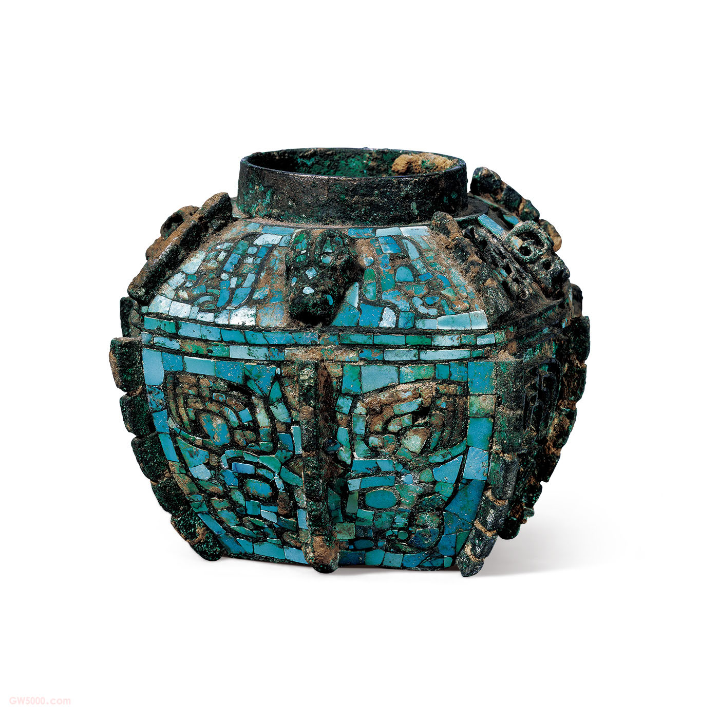 器直口,圆肩,腹部微鼓,下部斜收,平底。器肩、腹四转角处与器腹四面中部均置扉棱。器表通体铸槽,内嵌绿松石。器肩部四面中心饰以浮雕式兽首,器腹部四面各以扉棱为轴线,饰饕餮纹,角部较宽,内卷。整器工艺精湛,色彩瑰丽,在商代青铜器中实属罕见。